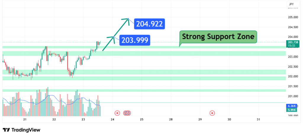 Prediction: We forecast that the price will hold above the 203.70 support zone, break through the 203.90 resistance, and rally towards our primary target at 204.90.