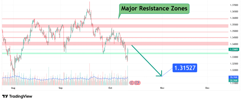 The most critical technical element is the Major Resistance Zone between approximately 1.3450 and 1.3700. The strength of this zone is derived from: