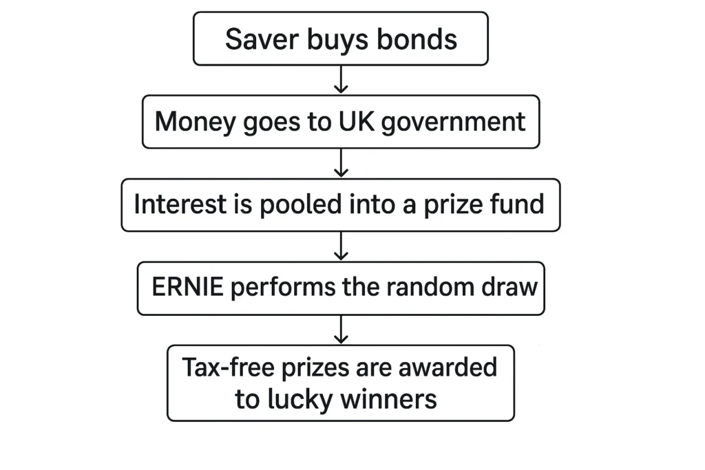 - Description: A simple flowchart showing: Saver buys bonds -> Money goes to UK government -> Interest is pooled into a prize fund -> ERNIE performs the random draw -> Tax-free prizes are awarded to lucky winners.